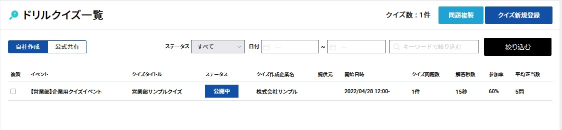 上記のタブは自社で作成したクイズと、公式が作成した問題マスタに登録されているクイズの違いです。