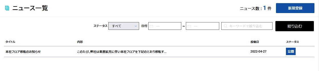 ニュース一覧では、これまで作成したニュースの一覧を確認できます。