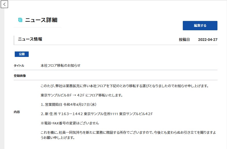ニュース情報の編集をするには、「ニュース詳細」の右上にある「編集する」を押します。