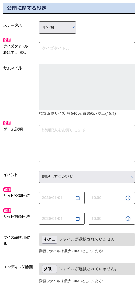 - クイズ終了時間・・・・・・待機画面へ入場できなくなる時間です。(「ご参加いただきありがとうございました」に変わります)