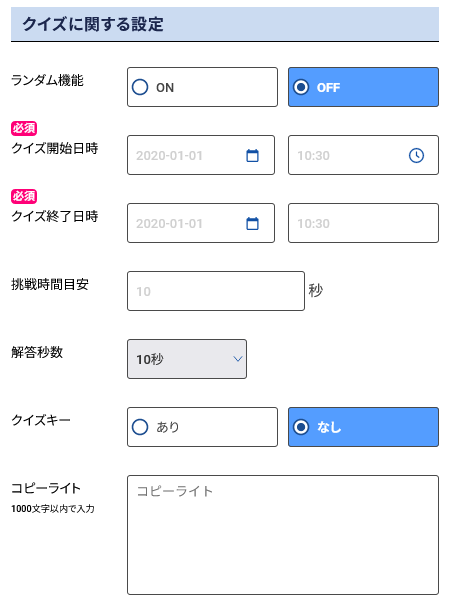 - クイズキーパスワード・・・クイズへ鍵をかけ、入場するためのパスワードを設定します。