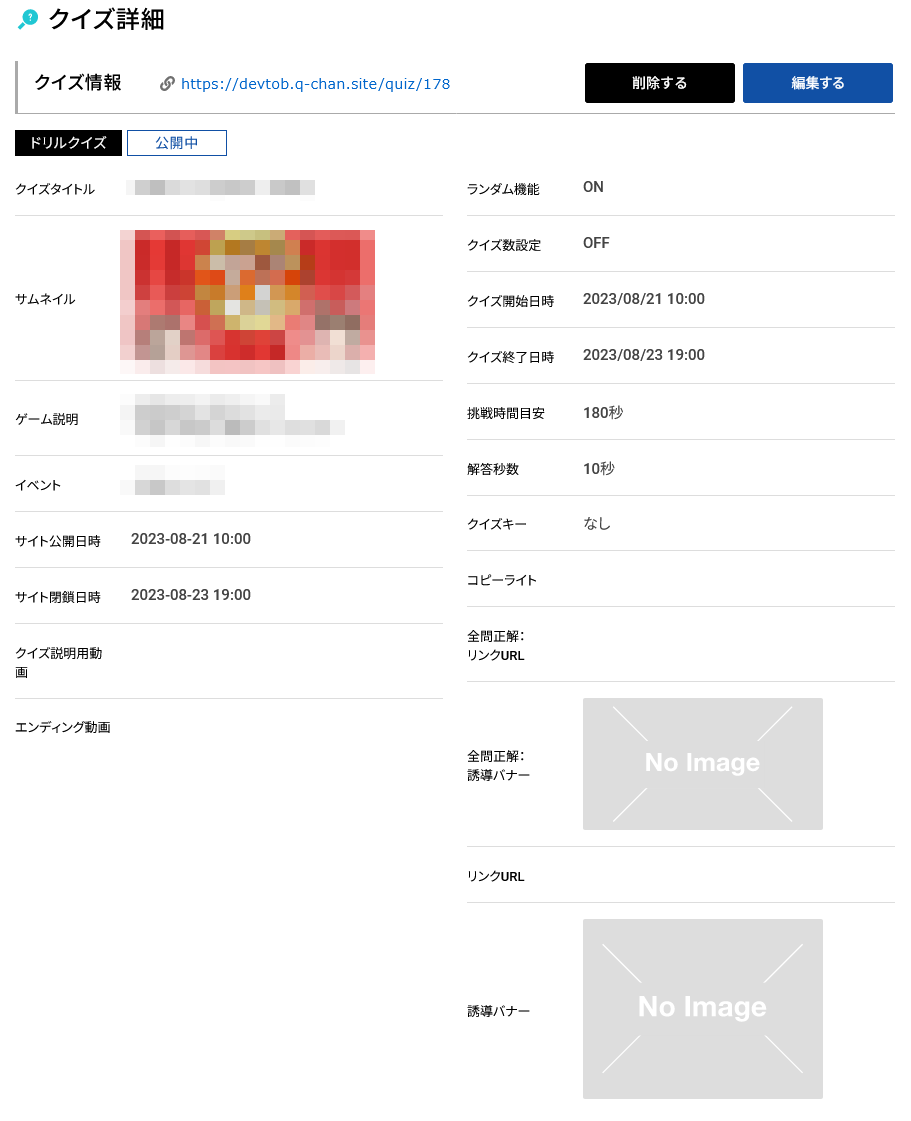 クイズ情報では、そのクイズにおける設定全般を確認することができます。